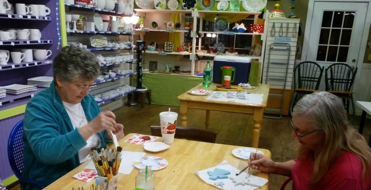 At our February meeting, we gathered in at Claymates in Dillsboro to create a unique piece of painted pottery. We pondered and fretted over our clay selections, and then our palettes of paint. Then we settled in to painting, chatting, snacking, and making arrangements to pick up our fired pieces later. It was great fun meeting at a different venue and welcoming new friends to our group. Here are some pictures "before" firing. Coming soon, the "after."